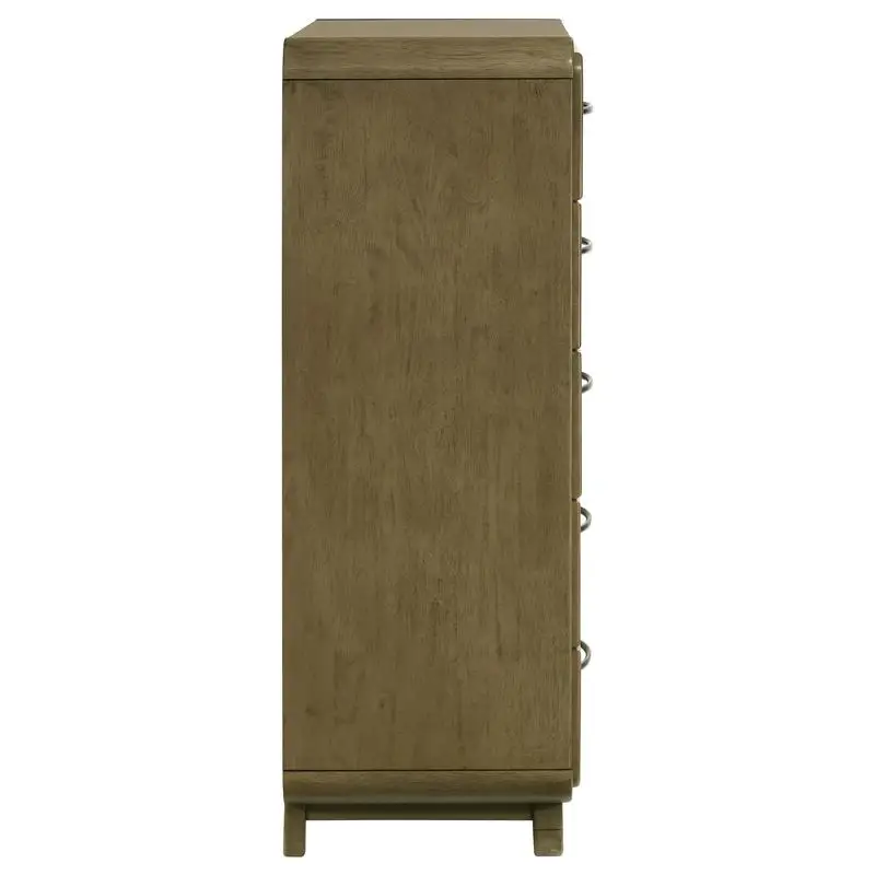 Five-drawer chest provides ample storage space, combining functionality with a sleek modern design to organize essentials