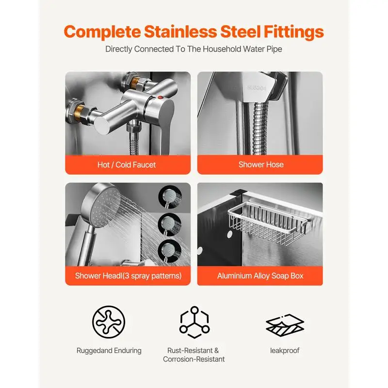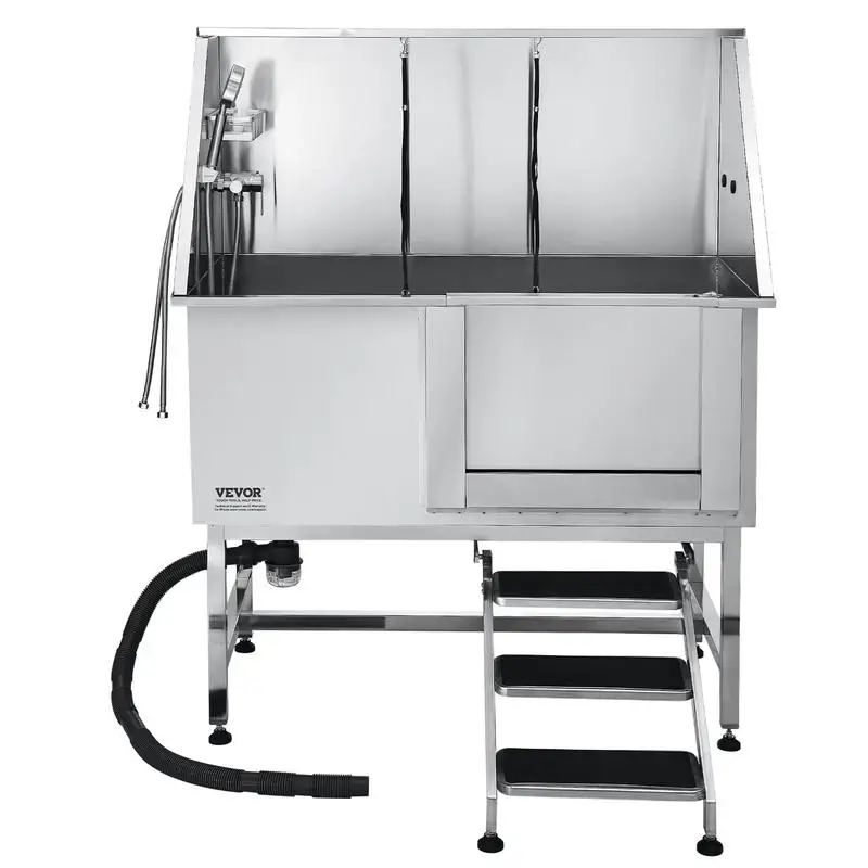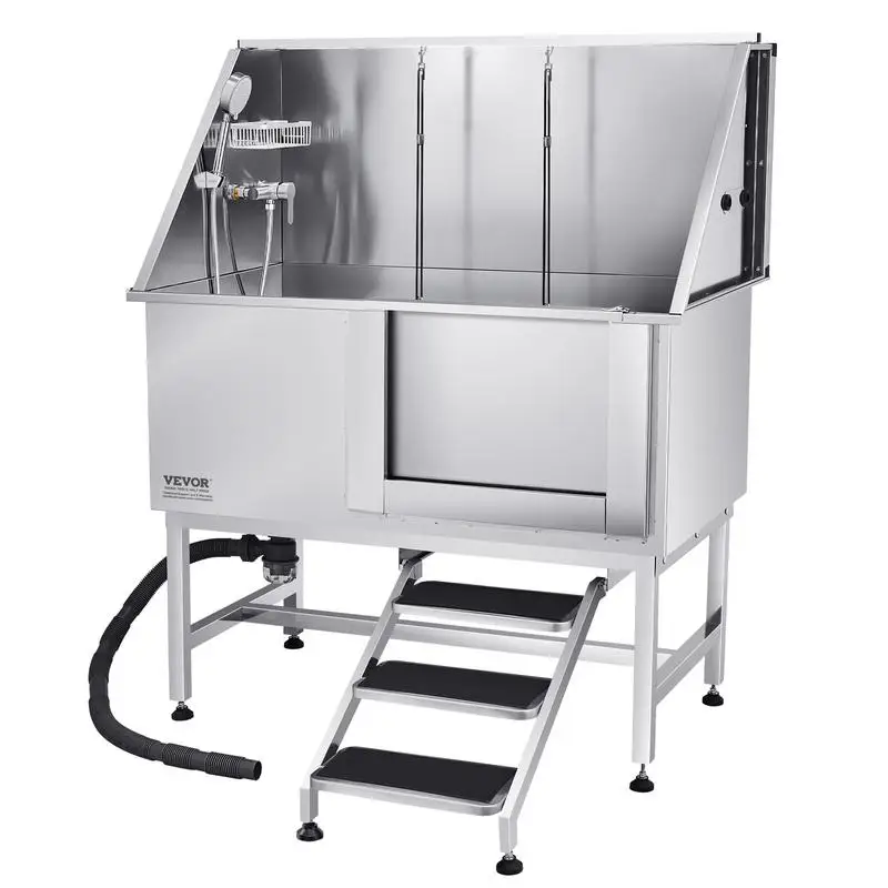 Integrated Design: The dog grooming tub is featuring hot and cold faucets, a dual-control showerhead, and a soap holder, this design makes pet bathing effortless and efficient. The PE water filter board provides a non-slip draining surface, while the included duckbill buckle stops pets from accidentally triggering the door during bath time, keeping them securely inside