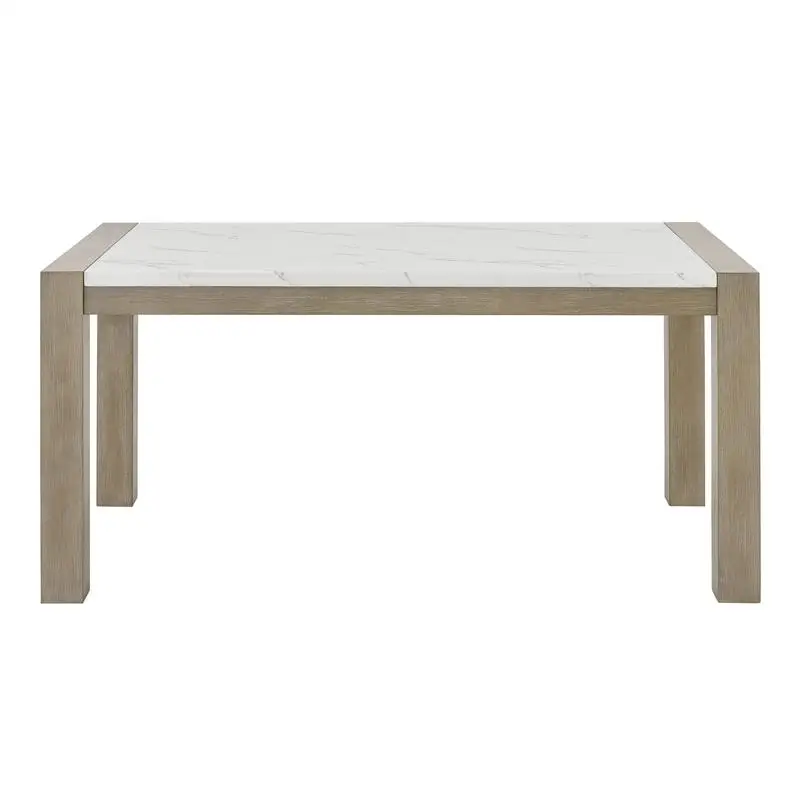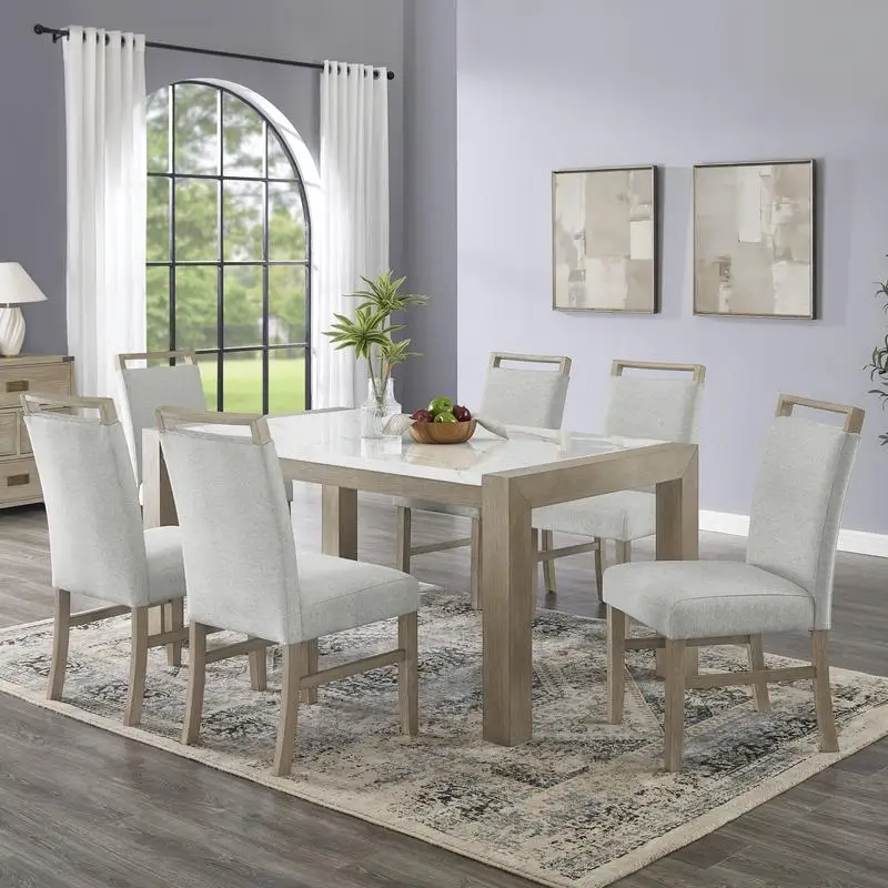Create a welcoming dining atmosphere with the Tabitha 7-Piece Dining Set, designed for both beauty and practicality. The spacious 66-inch table showcases a striking white faux marble surface, adding a touch of luxury while ensuring durability for everyday use. Its light oak-finished base brings warmth and stability, making it an ideal centerpiece for casual family dinners and special occasions alike. Accompanied by six comfortable chairs with soft upholstered seats, this set offers both support and style. Whether placed in a cozy breakfast nook or a formal dining room, the Tabitha Dining Set transforms every meal into a refined yet relaxed experience.