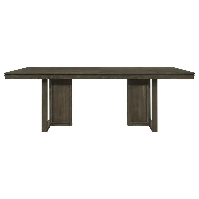 Chic transitional dining set features a sleek dark grey finish complemented by a subtle chevron pattern on the tabletop