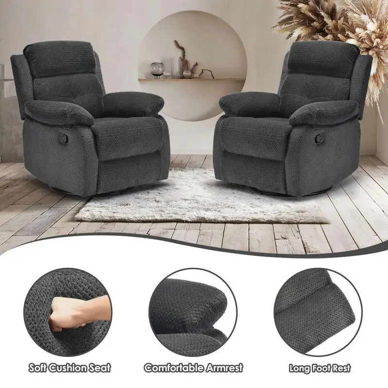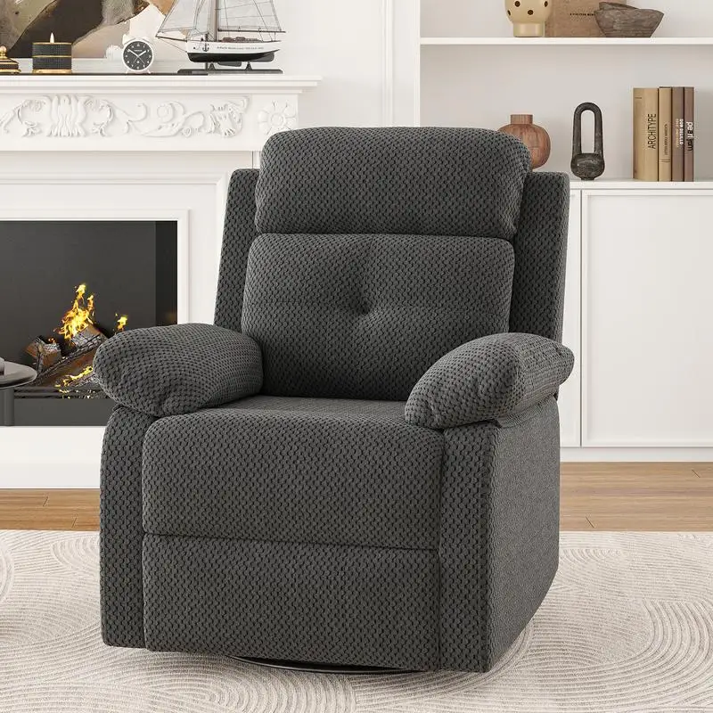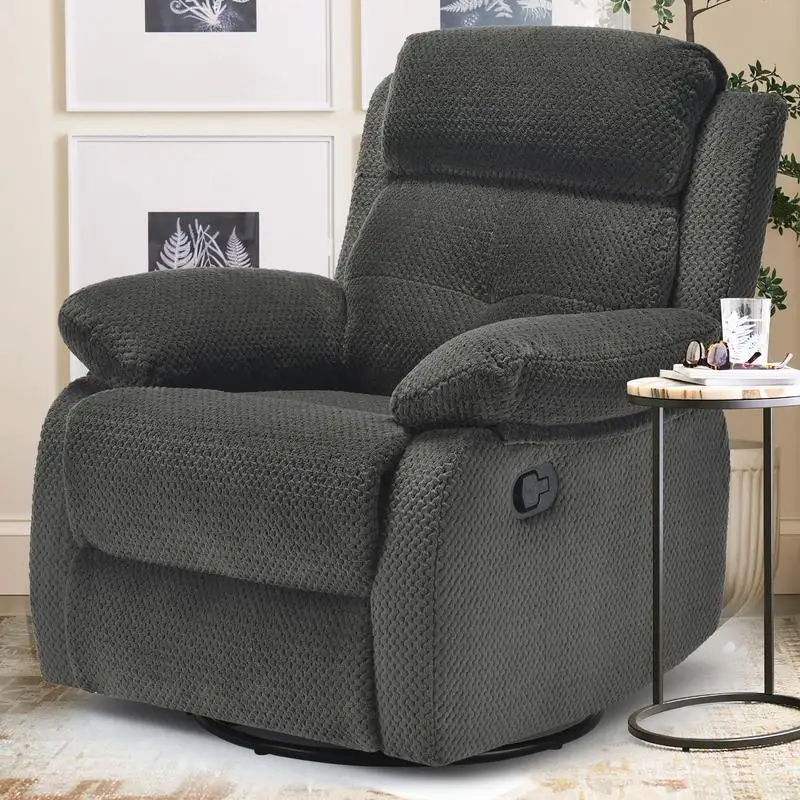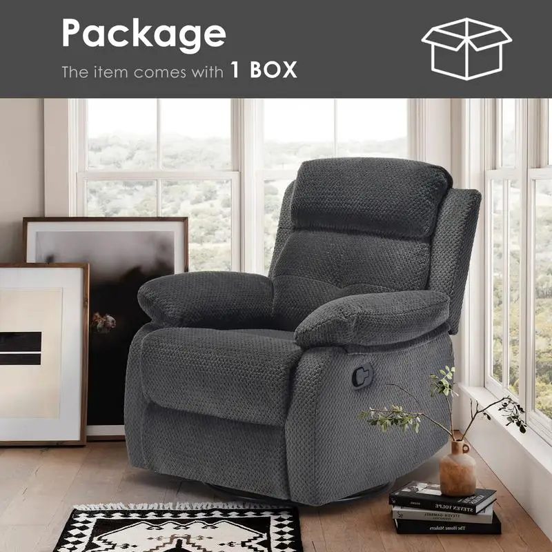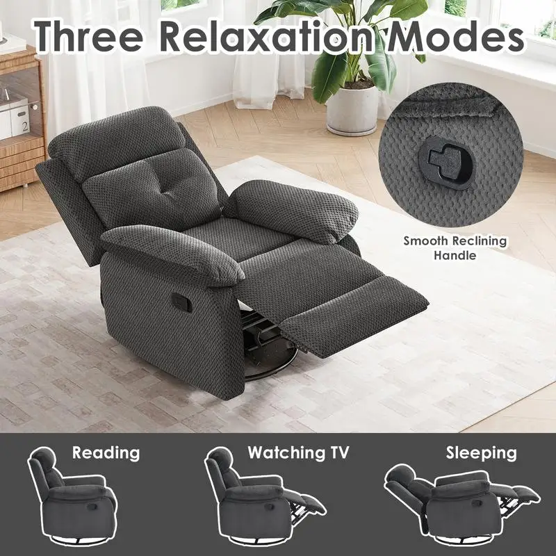 Swivel Rocker Recliner Chair:The swivel rocker recliner chair for adults have 360°Swivel, 30°Rocking, and 90-150 degree angle reclining function for versatile use. Max weight capacity is about 330lbs