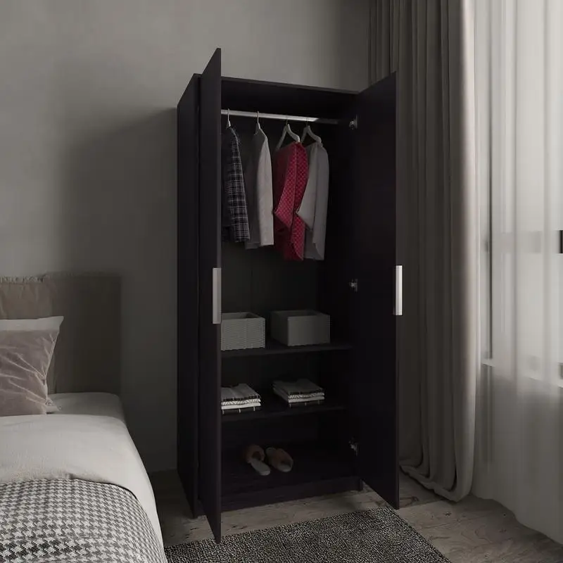 Double-door wardrobe opens to reveal spacious shelving and a hanging rod—ideal for organizing both folded clothes and hanging garments.
