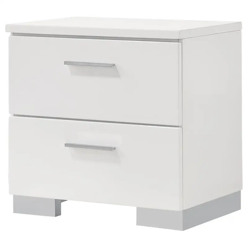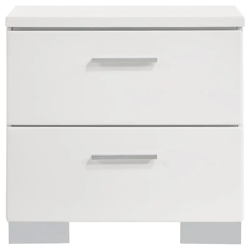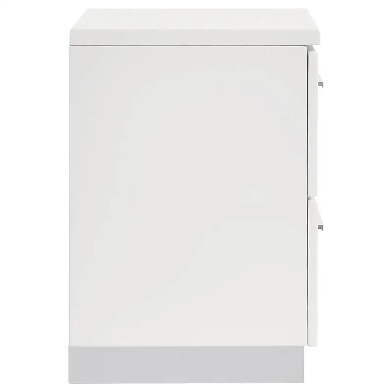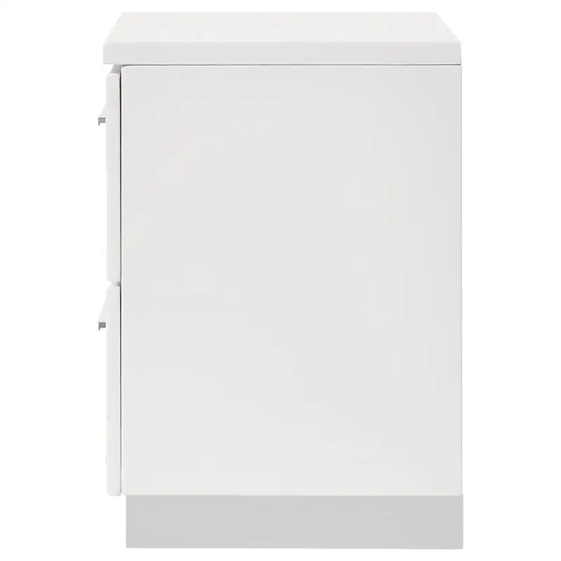 Modern 2-drawer nightstand features a bright white high gloss finish that enhances contemporary bedroom décor with polished elegance