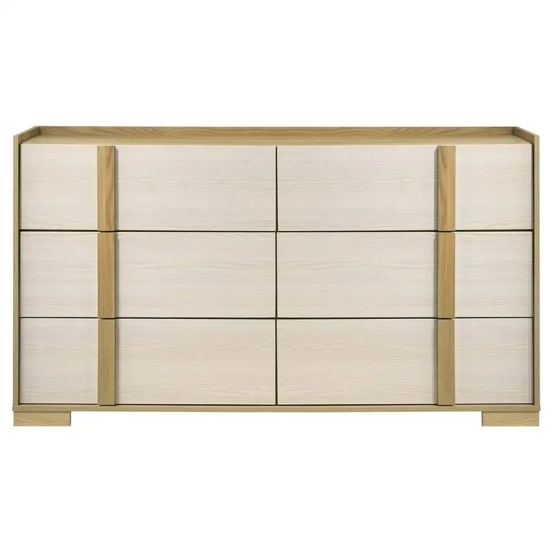 Six-drawer dresser showcases a sophisticated blend of natural wood tones and white melamine panels influenced by modern Italian design