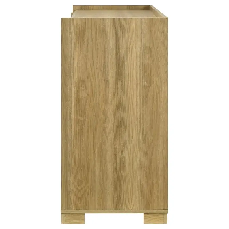 Vertical lines on natural finish hardware add sleek sophistication, enhancing the dresser’s clean lines and contemporary aesthetic perfectly