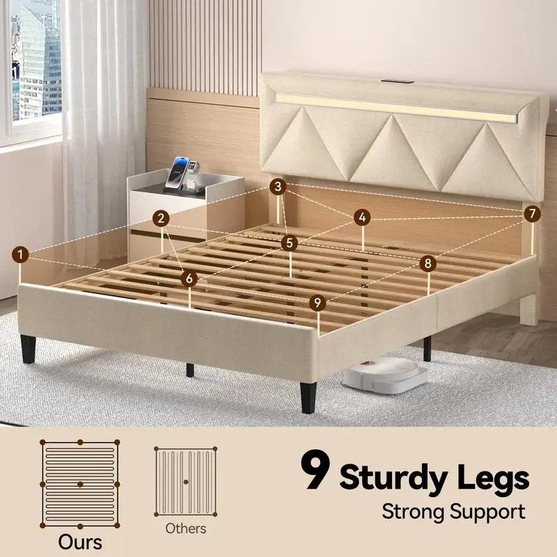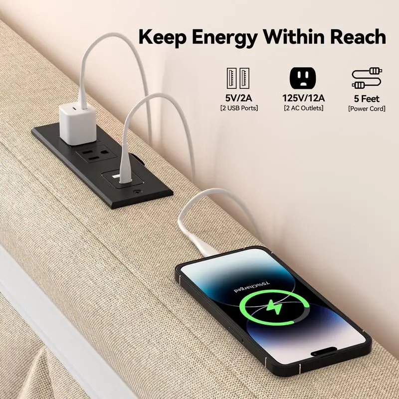 ⚡ Built-In Charging Hub with 4-Port Convenience Bed Frame Queen Size Bed Frame with Headboard: Stay powered up effortlessly! The queen bed frame with headboard integrates 2 AC outlets + 2 USB ports, eliminating messy cords and frantic socket hunts. Keep phones, tablets, and laptops charged overnight—your ultimate solution for modern bedroom tech needs.