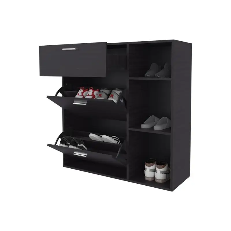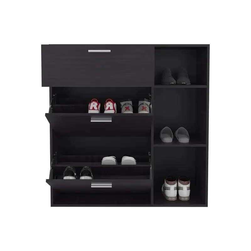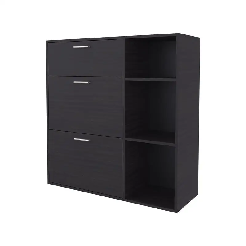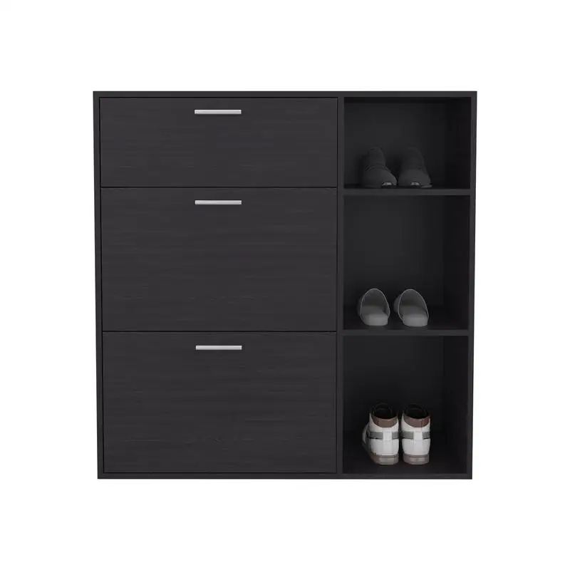 Product Name: Sierra Shoe Storage Cabinet, 2 Tilt-Out Drawers, 1 Top Drawer, 3 Open Side Shelves, Vertical Design, Entryway or Bedroom Use, Wenge